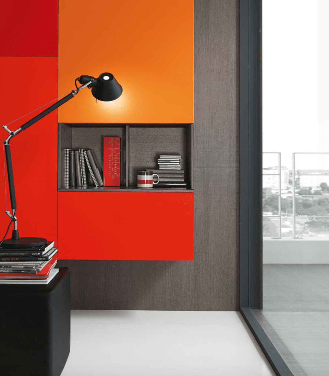 In foto vedrete le finiture Laccato opaco arancio, rosso e corallo e laccato poro aperto piombo.
